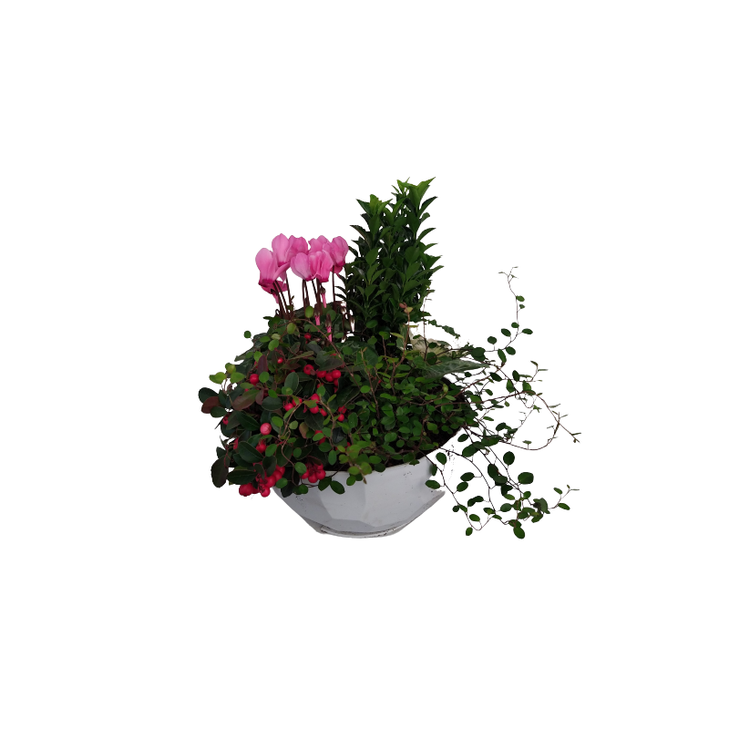 Composition extérieure coupe Quartz 24 cm Muehlenbeckia / fusain / cyclamen / gaultheria