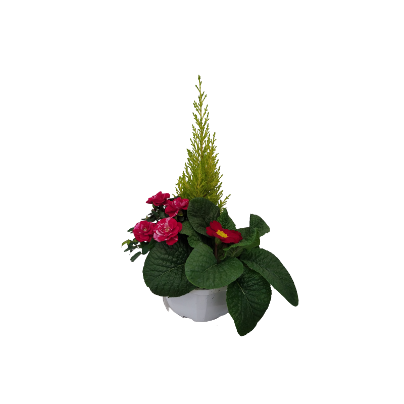 Composition avec 1 Sapin / 1 primevère/ 1 rosier gigi