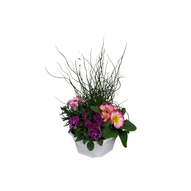 Composition extérieure 23 cm hexagone Juncus / Primevère / Oeillet / pensée