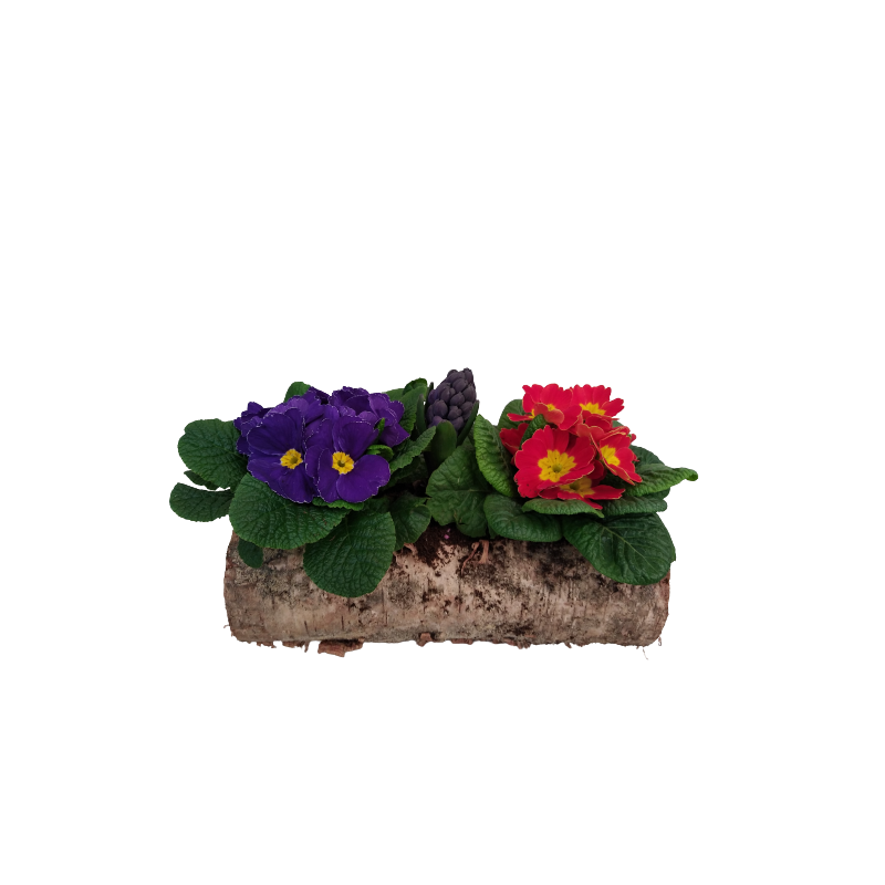 Composition extérieure bûche 30 cm 2 primevères / 1 jacinthe