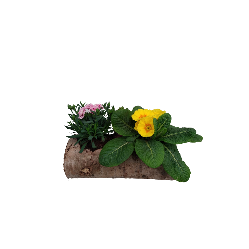 Composition extérieure bûche 30 cm oeillet / primevère / jacinthe