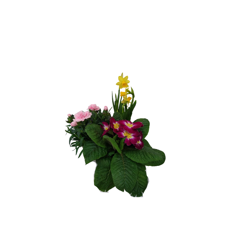 Composition extérieure coupe 18 cm narcisse / primevère / oeillet oscar