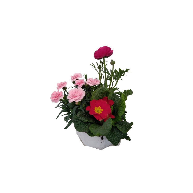 Composition extérieure coupe 18 cm Renoncule / Oeillet / primevère
