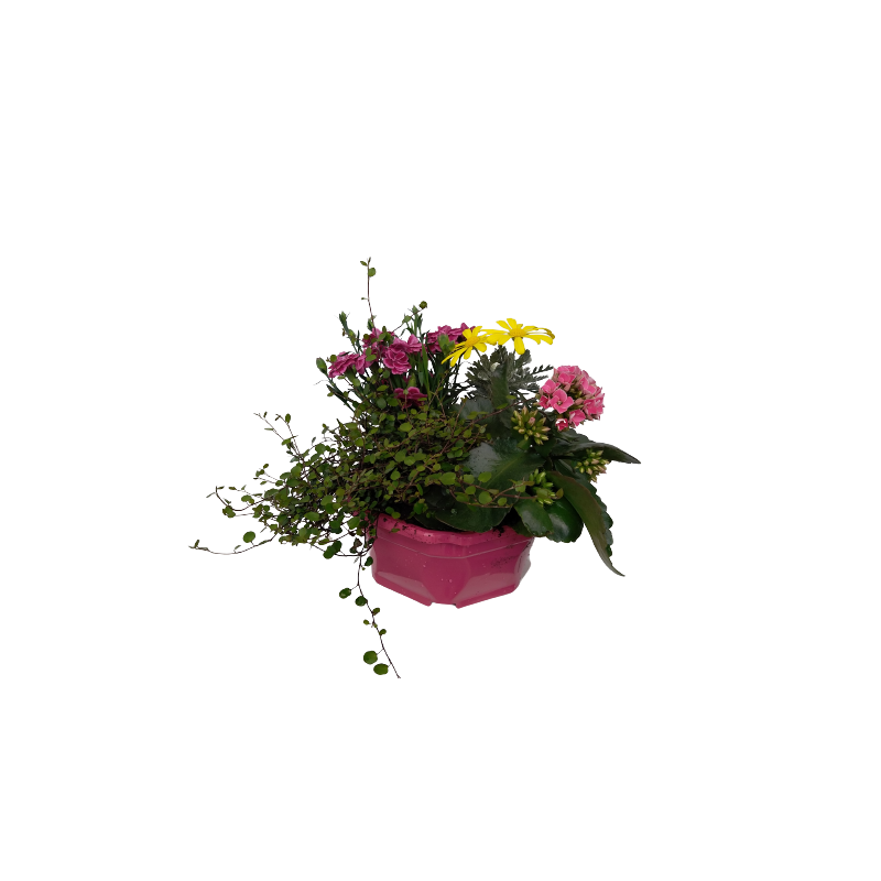 Composition extérieure avec 1 Oeillet 10.5 cm / 1 euryops / 1 muehlenbeckia / 1 kalanchoe 10.5 cm