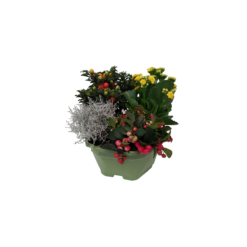 Composition extérieure 23 cm hexagone Solanum 10.5 / kalanchoe 10.5 / calocephalus / gaultheria 9.5 cm