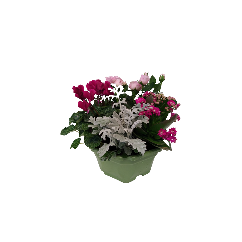 Composition extérieure 23 cm hexagone Rosier 10 / cyclamen 10.5 / kalanchoe 10.5 / cineraire