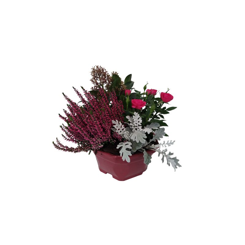 Composition extérieure avec Rosier 10.5 / cinéraire / skimmia 2-3 fleurs / calluna 10.5 cm