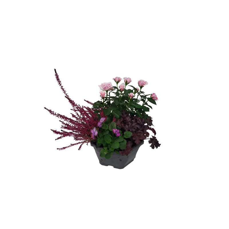 Composition extérieure avec Rosier 10.5 / calluna teintée 10 / pensée 9 cm / heuchère 10.5