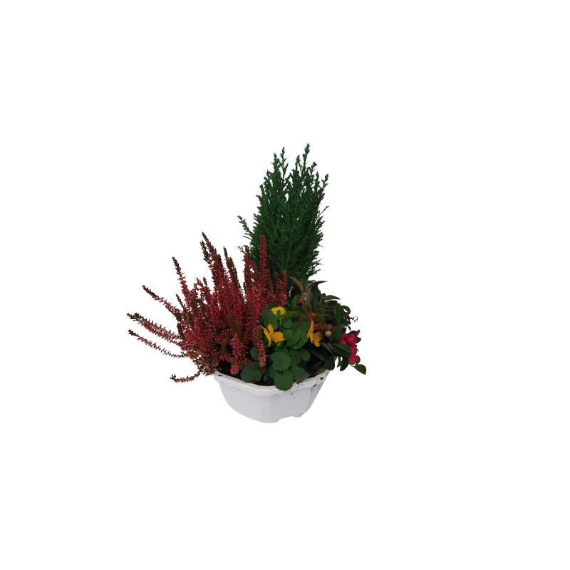 Composition extérieure avec Sapin vert 9 cm / calluna teintée 10 / pensée 9 cm / gautlheria 9 cm