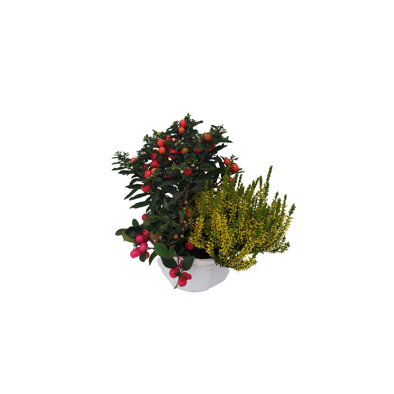Composition extérieure coupe 18 cm Solanum 10.5 / gaultheria 9 cm / calluna teintée 10