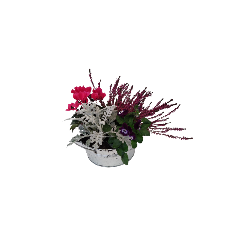 Composition extérieure bassine zinc 20 cm Cyclamen 10 / calluna teintée 10 / cinéraire / pensée