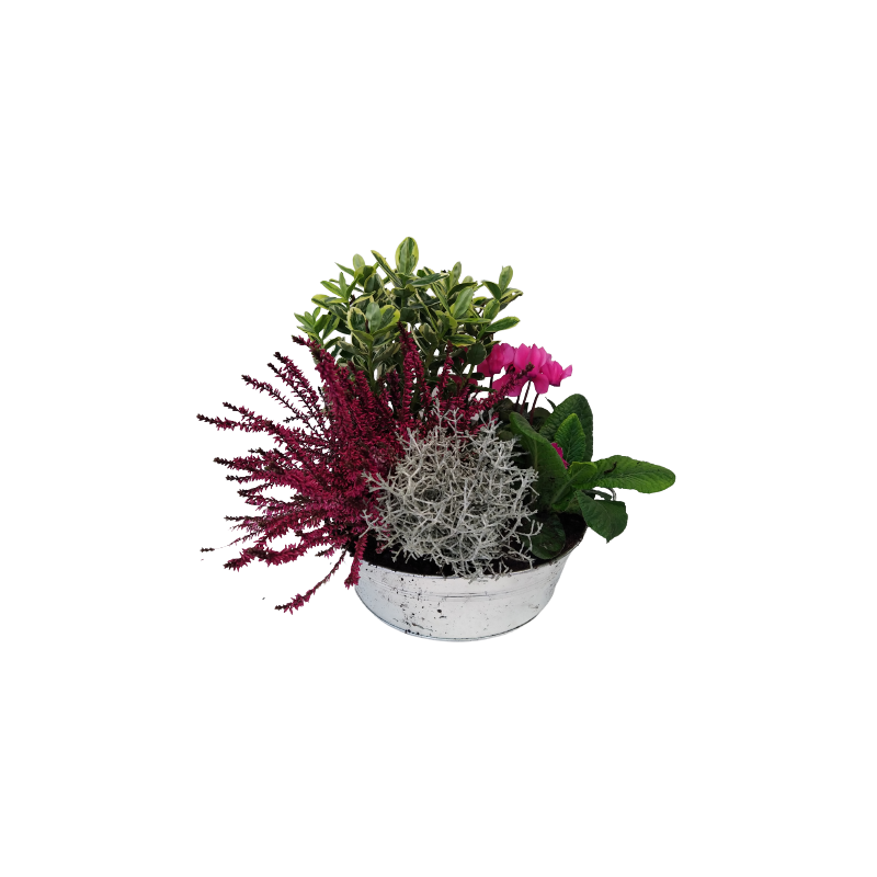 Composition extérieure bassine zinc 25 cm Véronique 10 / cyclamen mini / calluna teintée / calocephalus / primevère
