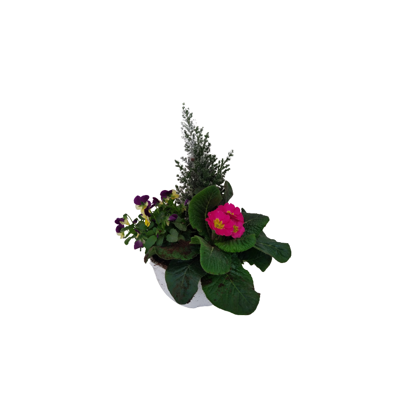 Composition extérieure coupe 18 cm Sapin neige 9 / primevère / pensée 9 *TVA 20%
