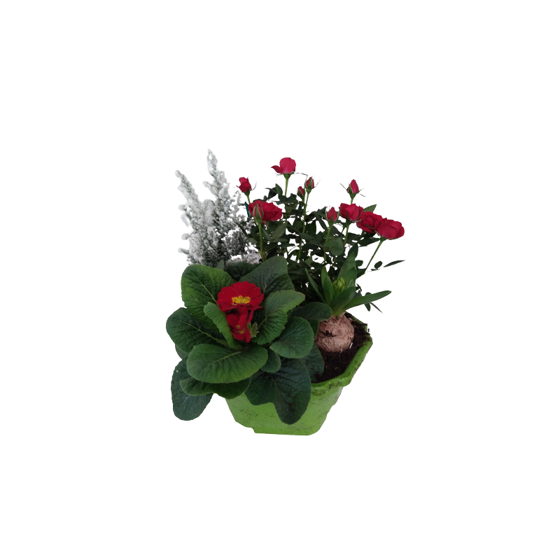Composition extérieure avec sapin neige 9 / rosier 10 / jacinthe / primevère *TVA 20%