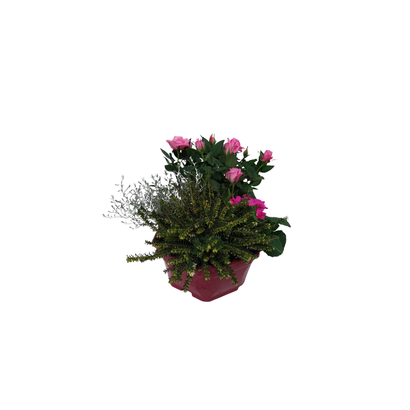 Composition extérieure 23 cm hexagone Rosier 10 / calocephalus / darley 10 / primevère