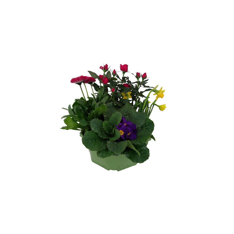 Composition extérieure avec Rosier 10.5 / Paquerette / primevère / narcisse 9 cm
