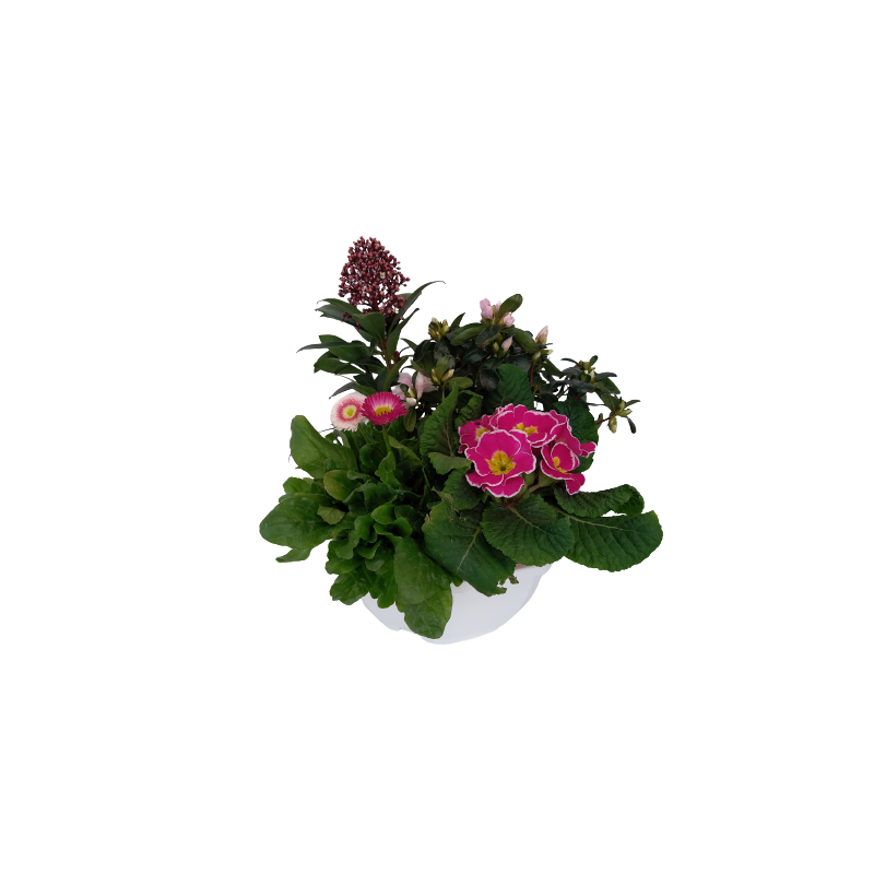 Composition extérieure avec Skimmia 9 / Azalée 12 / Primevère / Paquerette