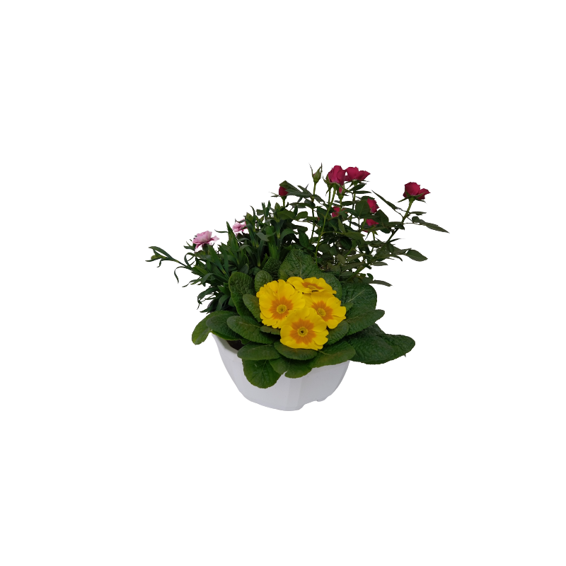 Composition extérieure avec Rosier 10.5 / Oeillet 10.5 / primevère