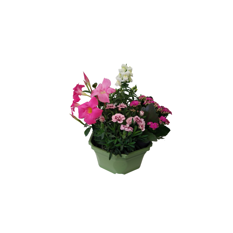 Composition extérieure 23 cm hexagone Dipladenia godet / muflier 10.5 / oeillet oscar / kalanchoe 10.5