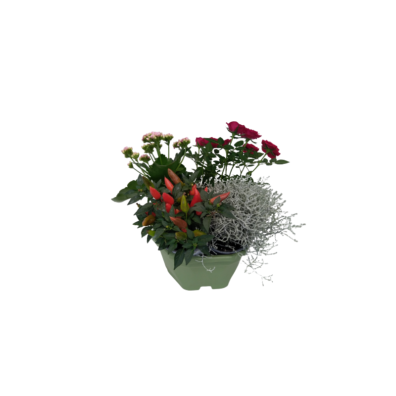 Composition extérieure avec Rosier 10.5 / kalanchoe 10.5 / piment 10.5 / calocephalus