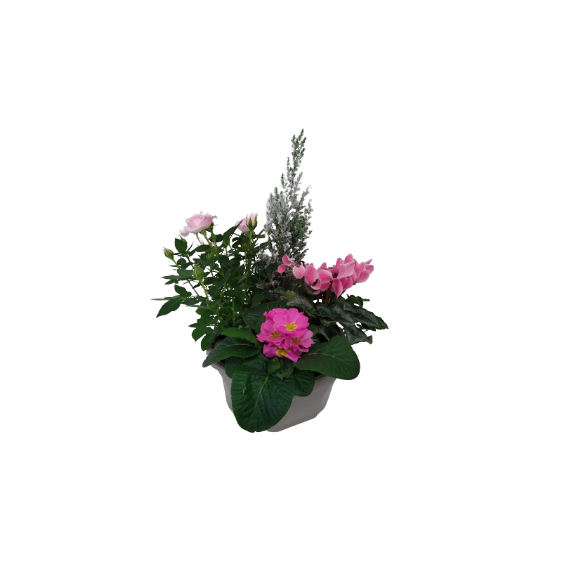 Composition extérieure 23 cm hexagone sapin neige 9 / Rosier 10 / cyclamen 10 / primevère *TVA 20%