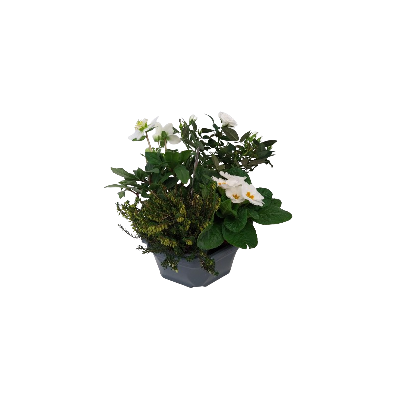 Composition extérieure 23 cm hexagone Rosier 10 / hellebore 12 / darley 10 / primevère