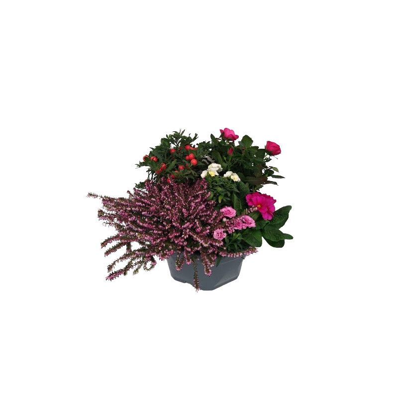 Composition extérieure 30 cm hexagone Rosier 10.5 / solanum 13 / giroflée / primevère / darley 10 / oeillet