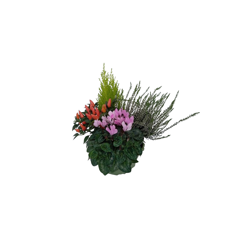 Composition extérieure avec Sapin 9 / calluna 10 / cyclamen 10 / piment 10