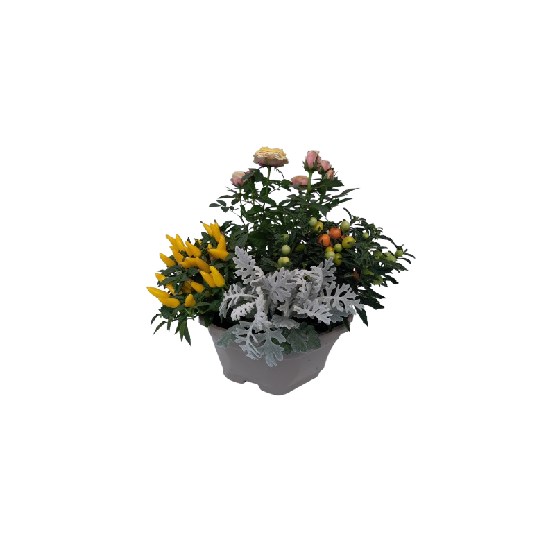 Composition extérieure Rosier / piment / solanum 10 / cinéraire