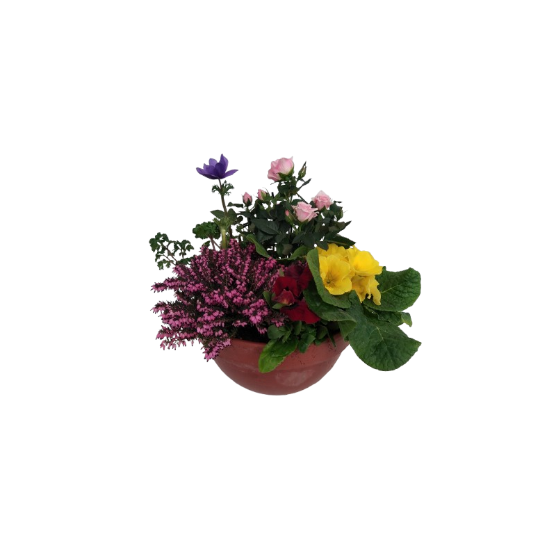 Composition extérieure terre cuite 25 cm "Ciotala Ibis" avec Rosier / primevère / Darley / Anemone / pensée