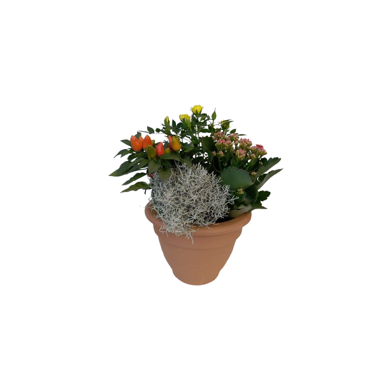 Composition extérieure terre cuite 27 cm "Campana" avec Rosier 10 / piment 10 / kalanchoe 10 / calocephalus