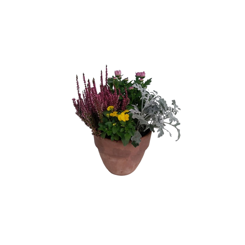 Composition extérieure terre cuite 20 cm "Palladio" avec Chrysanthème 13 / Calluna Teintée 10 / Cinéraire / pensée