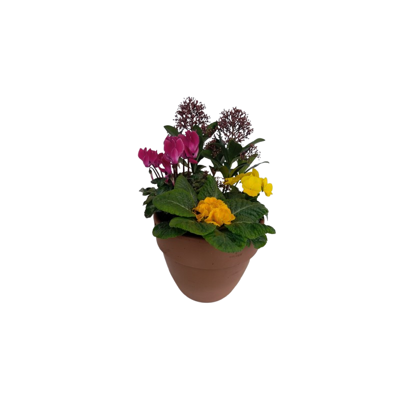 Composition extérieure terre cuite 20 cm "Palladio" avec Skimmia / pensée / primevère / cyclamen 10