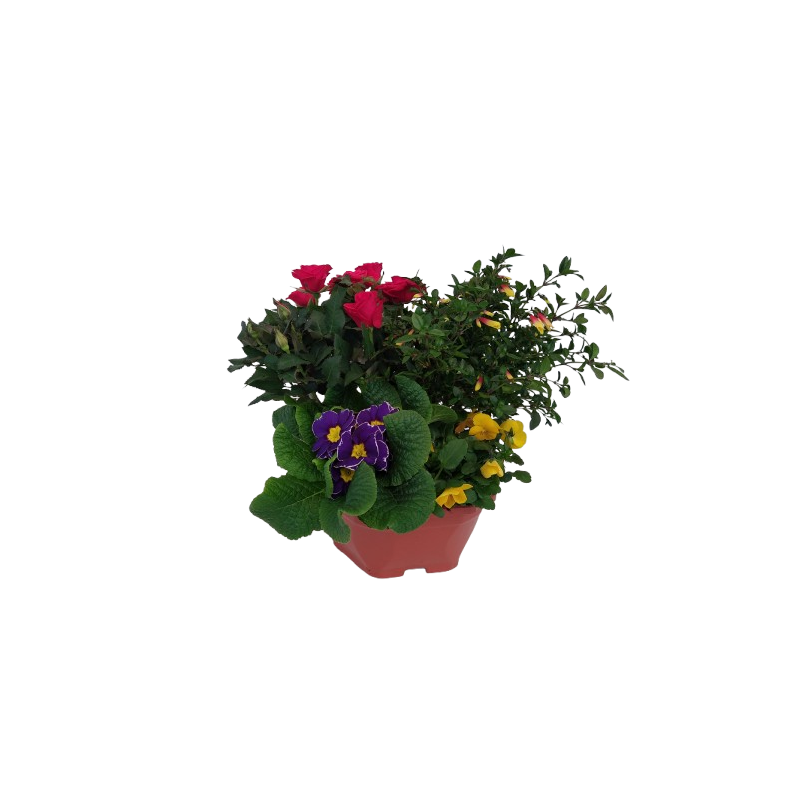 Composition extérieure Rosier 10.5 / Libonia 13 / Primevère / pensée