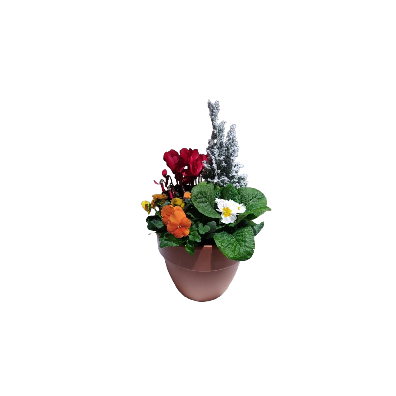 Composition extérieure terre cuite 20 cm "Palladio" avec Sapin neige 9 / Cyclamen 10 / primevère / pensée *TVA 20%