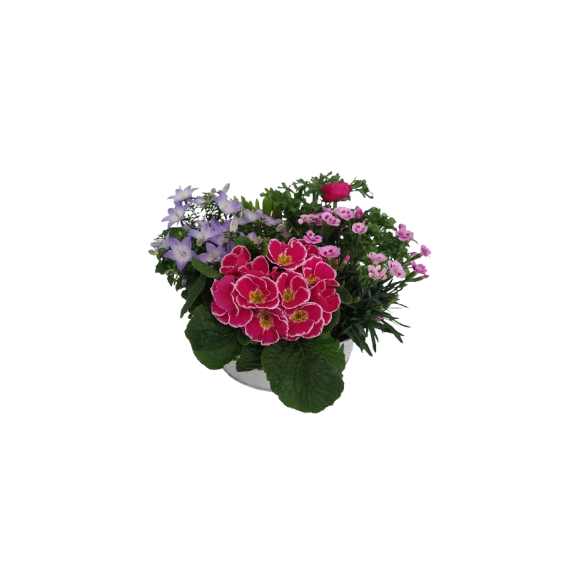 Composition extérieure Bassine zinc naturel 25 cm Berlingot (interflora) avec Renoncule/oeillet/campanule/narcisse 12/primevère