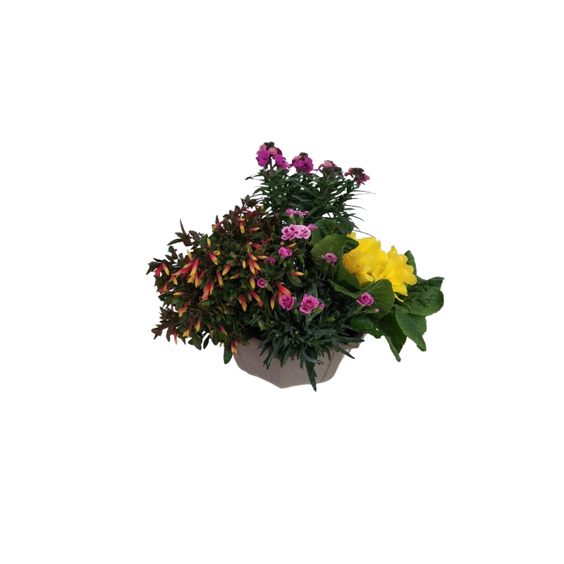 Composition extérieure 27 cm hexagone Libonia / Primevère / oeillet / giroflée