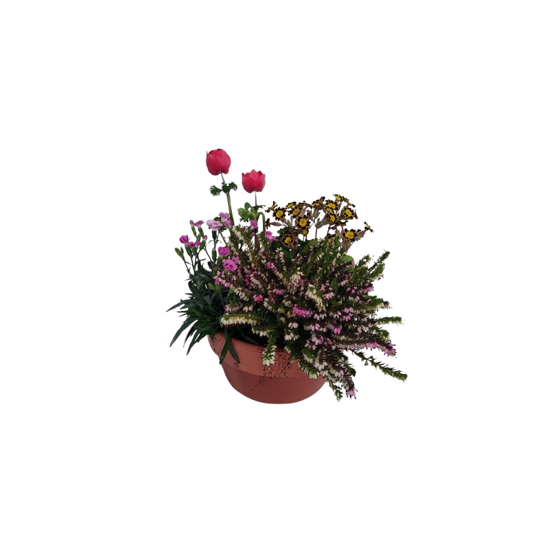 Composition extérieure terre cuite 21 cm "Mini vaso" avec Anemone / darley 10 / primevère haute 10.5 / oeillet 10.5