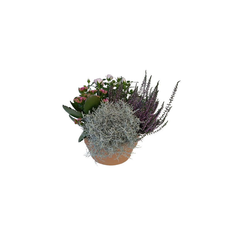 Composition extérieure terre cuite 21 cm "Mini vaso" avec Rosier / calluna 10 / kalanchoe 10 / calocephalus