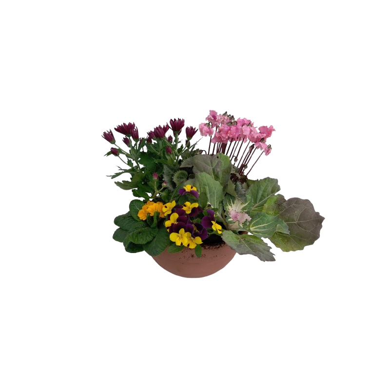 Composition extérieure terre cuite 30 cm "Mini vaso" avec Cyclamen 13 / Chrysanthème 13 / pensée / chou / primevère