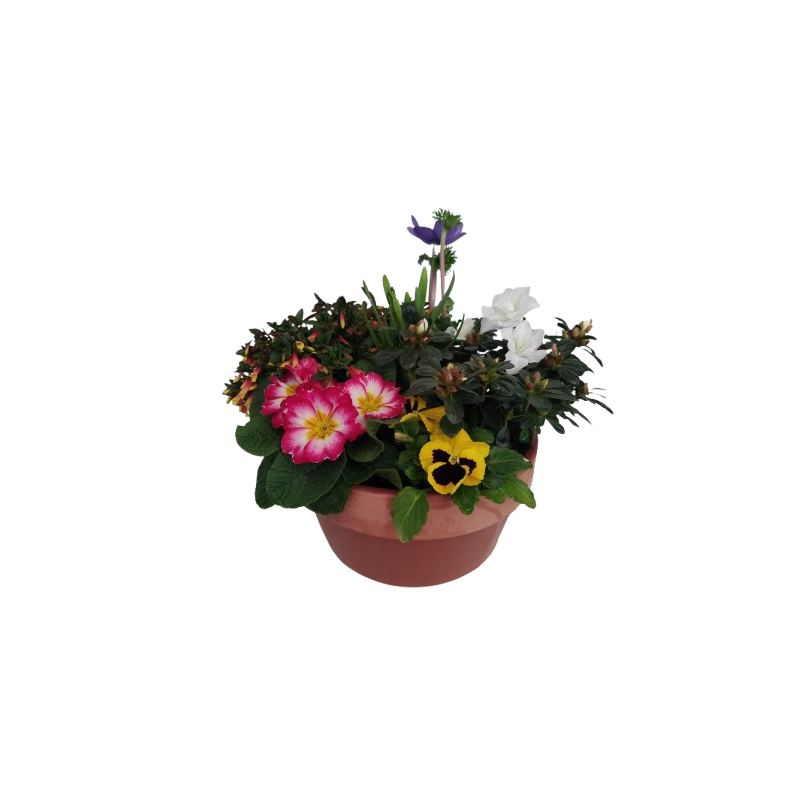 Composition extérieure terre cuite 27 cm "Mini vaso" avec Anemone/Azalée japonaise 10/Narcisse 9/Libonia/Primevère/pensée