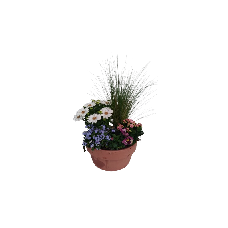 Composition extérieure terre cuite 27 cm "Mini vaso" avec Stipa / Osteopernum 14 / Kalanchoe 10 / Myosotis / pensée 9