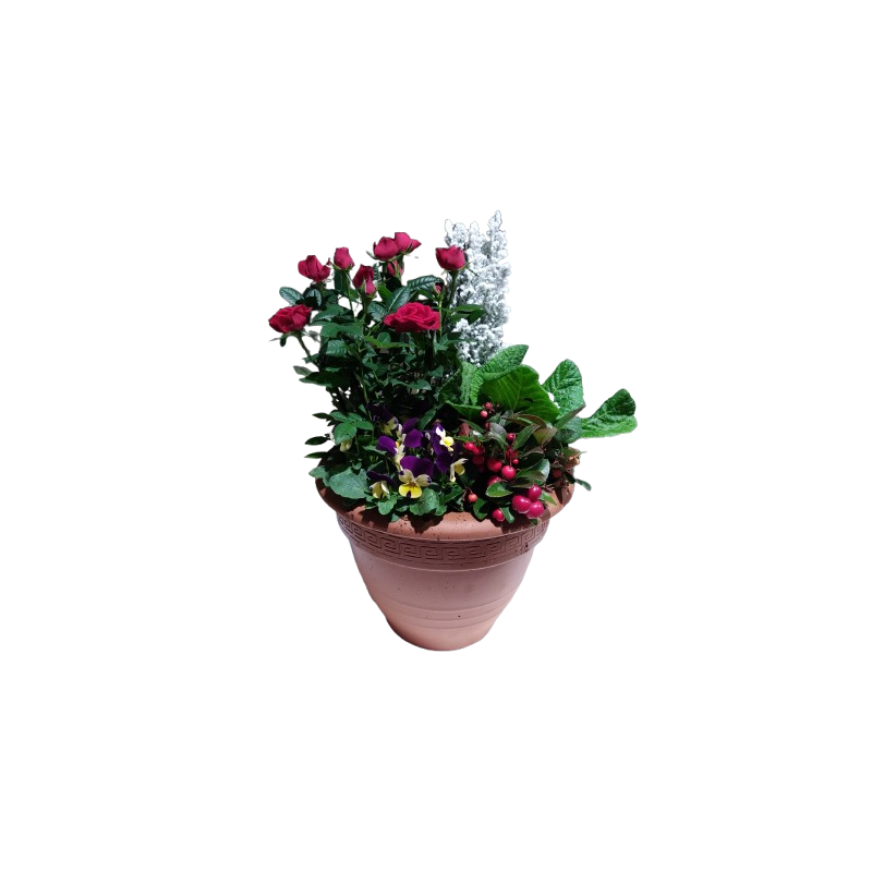 Composition extérieure terre cuite 27 cm "Campana" avec Sapin neige 9/ Rosier 10/Gaultheria /Primevère/ Pensée *TVA 20%