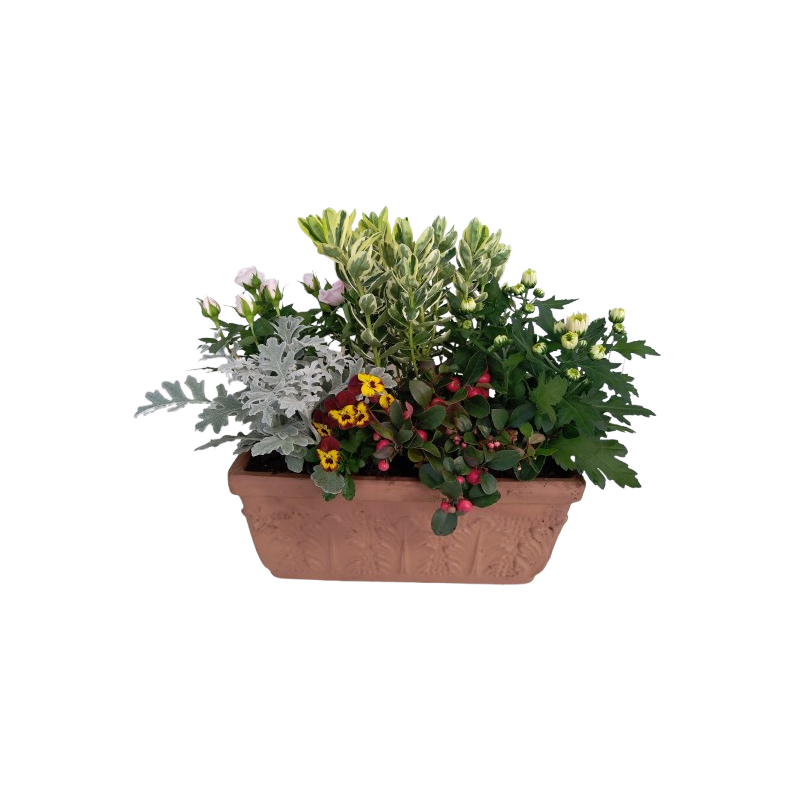 Composition extérieure terre cuite jardi 36 cm "Casseta Roma" Rosier 10/Véronique 10/Chrysanthème 13/Cinéraire/pensée/Gaultheria