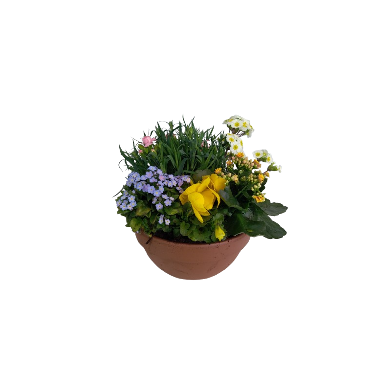 Composition extérieure terre cuite 25 cm "Ciotala Ibis" avec Oeillet 13/Primula haute/Myosotis / Kalanchoe 10/Pensée