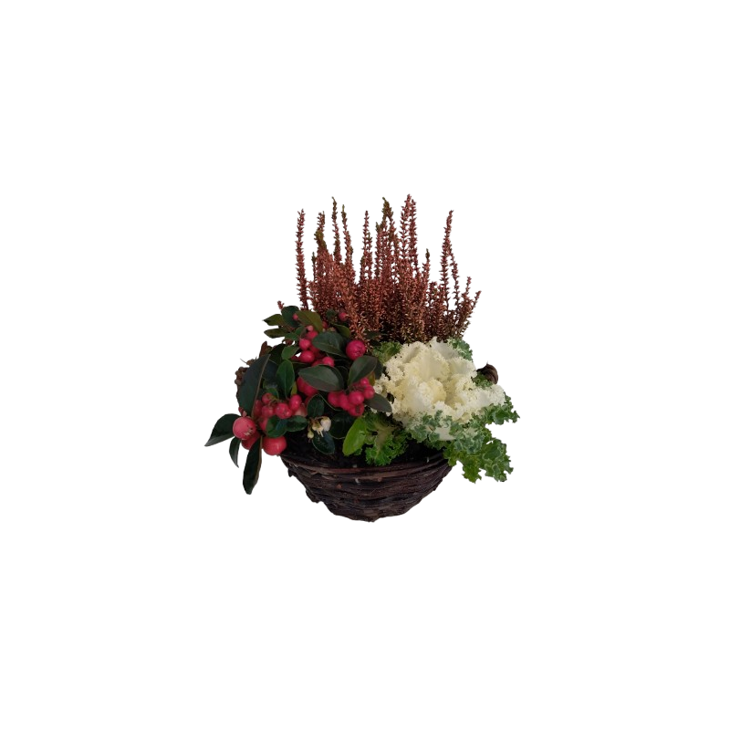 Composition extérieur panier osier 20 cm avec Calluna teintée / gaultheria / chou