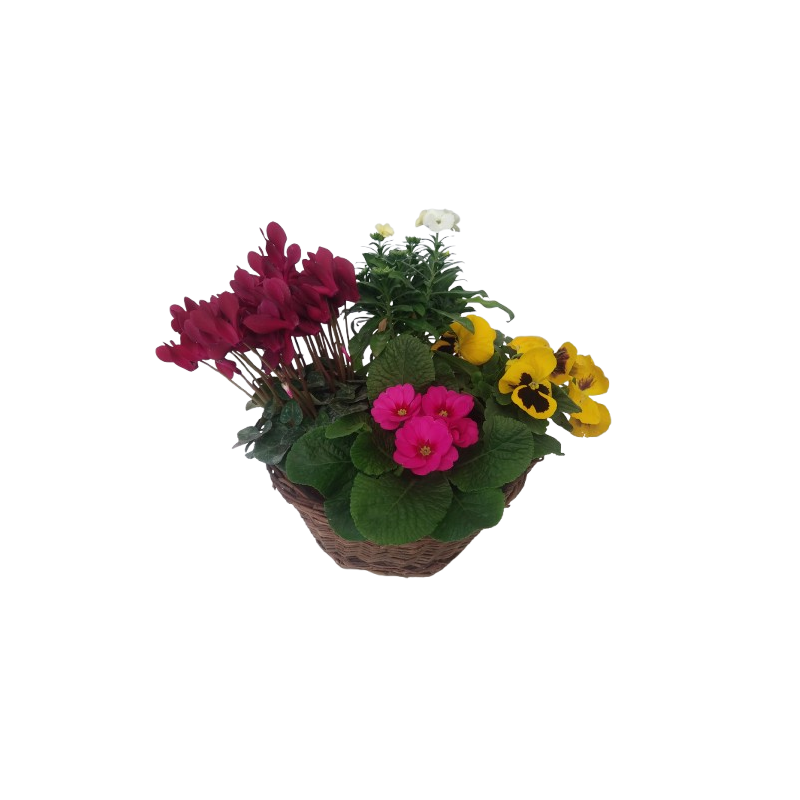 Composition extérieur panier osier 25 cm avec Giroflée / Cyclamen 10 / Primevère 10 / Pensée