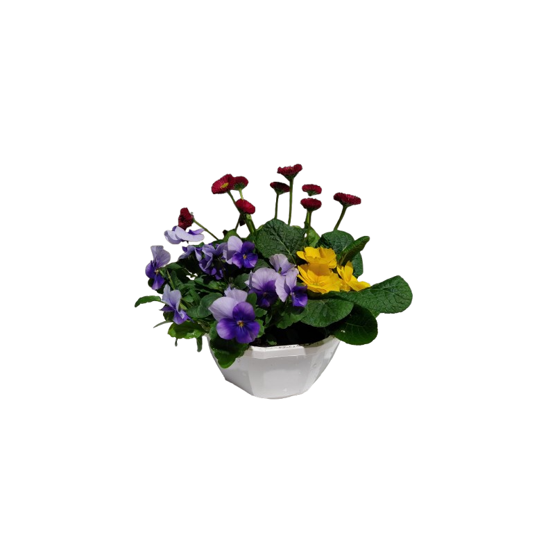 Composition extérieure 18 cm hexagone Pensée / Paquerette / Primevère