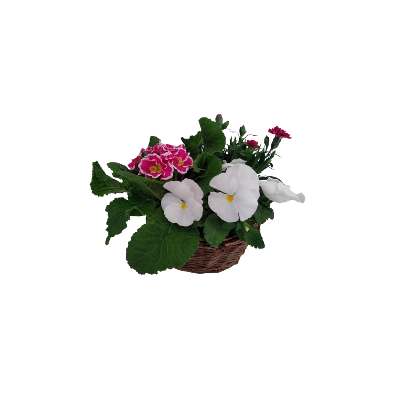 Composition extérieure coupe osier 20 cm avec Pensée / primevère / oeillet