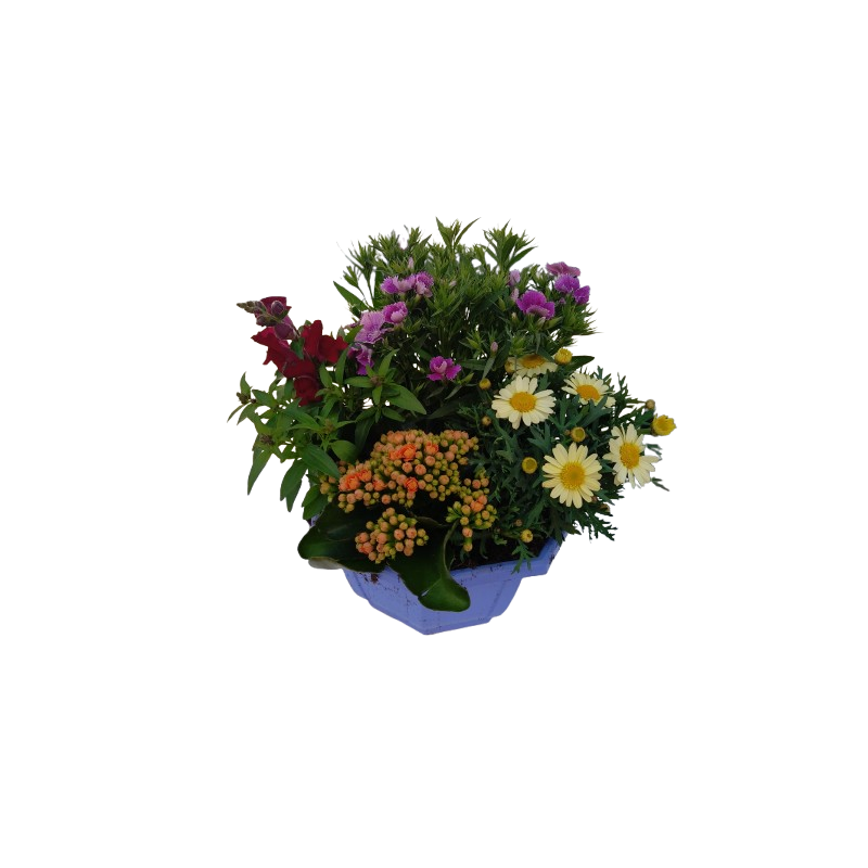 Composition extérieure 27 cm couleur hexagone Oeillet de chine / muflier 10 / Kalanchoe 10 / Anthemis 10